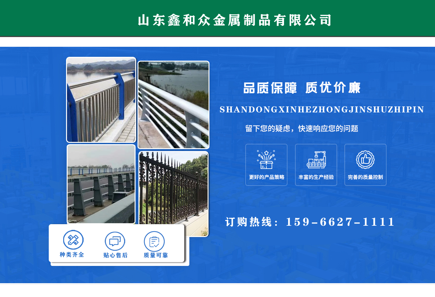 山東鑫和眾金屬制品有限公司主要產(chǎn)品有防撞護欄,橋梁護欄,道路護欄,河道護欄,不銹鋼護欄等護欄。提供設計方案,一站式定制,包您滿意價格優(yōu)惠,歡迎來電咨詢! 公司常年從事銷售護欄防撞護欄,橋梁護欄,道路護欄,河道護欄,不銹鋼護欄,橋梁鋼護欄,河道燈光護欄等。產(chǎn)品廣泛應用于橋梁、河道、旅游景區(qū)、道路、公路、公園、小區(qū)、景觀、道路防撞等領(lǐng)域。 公司產(chǎn)品均采用優(yōu)質(zhì)不銹鋼材料,符合相關(guān)標準。各種型號不銹鋼復合管及護欄,質(zhì)量嚴格把控。產(chǎn)品強度高、耐腐蝕、焊接牢固、抗沖擊、性能好,防撞護欄結(jié)構(gòu)簡單、美觀實用大方。 歡迎前來訂購!...